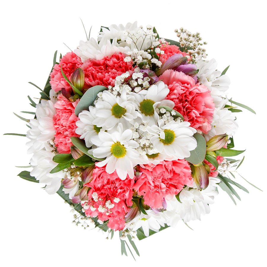 Delight your loved ones with our charming seasonal flower arrangement. This exquisite bouquet combines snow-white chrysanthemums, delicate gypsophila, and light pink carnations, elegantly entwined with lush aspidistra leaves for a refined appearance.